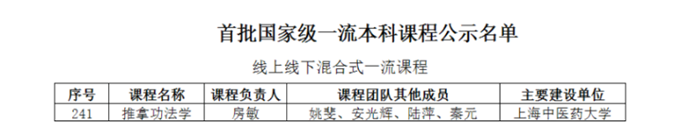 教育部近日公示首批国家级一流本科课程认定结果,河豚直播足球 房敏教授领衔的《推拿功法学》入围“线上线下混合式一流课程”、针推文献教研室徐平教授领衔的《针灸医籍选读》入围“线上一流课程”。