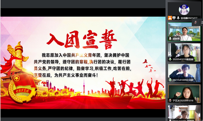 为庆祝中国共产主义青年团成立100周年,全面贯彻习近平新时代中国特色社会主义思想,深入学习贯彻习近平总书记在中国人民大学考察时的重要讲话精神,引导广大团员青年厚植爱国情怀,以实际行动迎接党的二十大召开,5月1日,在“五四”青年节到来之际,河豚直播足球 团委组织开展“入团云宣誓”仪式。5名新发展的团员庄严宣誓,其他与会团员重温了入团誓言。
